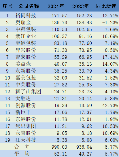 Jiamai Packaging, a tinplate can manufacturer, achieved revenue of 3.20 billion yuan, up 1.52% year on year; Zhongrong Shares, a leader in folding color boxes, achieved revenue of 2.782 billion yuan, up 7.30% year on year.