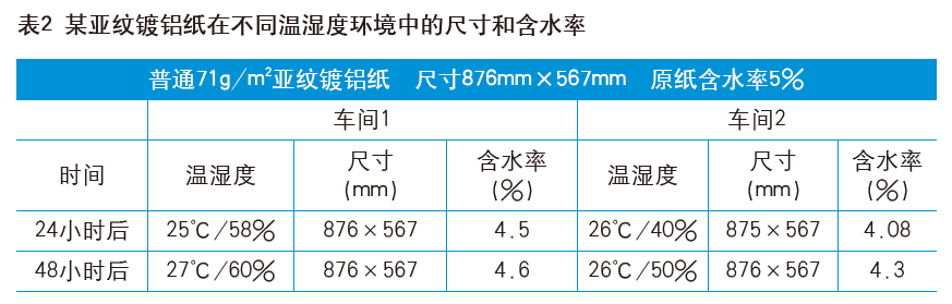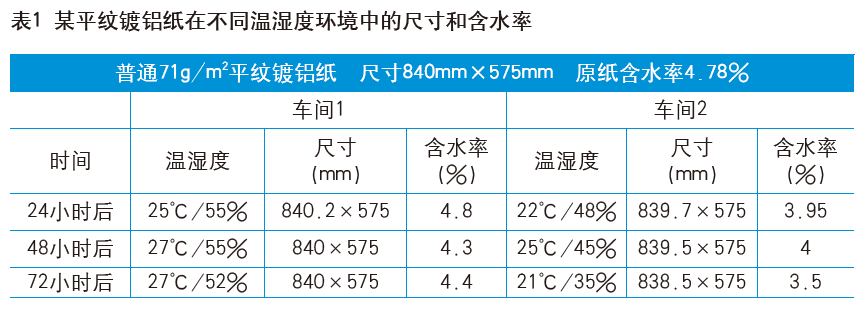 Through the analysis of the data listed in Tables 1 to 4, we found that no matter what type of paper is placed in different temperature and humidity environments, it will cause abnormal situations of paper size reduction or increase, but the appropriate temperature and humidity for different papers are different. As shown in Table 1, for the ordinary 71g/m2 plain grain aluminum plated paper in Workshop 2, the horizontal dimensions of the paper measured in three sampling tests have all decreased, especially for the paper collected in the workshop environment with a temperature and humidity of 21 ℃/35% after 72 hours, the horizontal dimensions have decreased by 1.5mm; However, for the same type of paper in Workshop 1, only the paper collected at a temperature and humidity of 25 ℃/55% after entering the workshop for 24 hours showed a lateral increase of 0.2mm and a slight increase in moisture content. However, in the two sampling tests with an ambient temperature and humidity of 27 ℃/55% and 27 ℃/52%, although the moisture content of the paper decreased, the size did not change. The matte aluminum plated paper in Table 2 has only been collected in a temperature and humidity of 26 ℃/40% after entering workshop 2 for 24 hours. The horizontal size of the paper has been reduced by 1mm, and the size of the paper sampled and measured when the humidity is not less than 50% has not changed. The single-sided copper coated paper in Table 3 only showed no change in size when sampled at a temperature and humidity of 25 ℃/40%, while others showed varying degrees of increase. The lateral size of the paper measured at a temperature and humidity of 22 ℃/60% even increased by 2.5mm. The waterproof coated paper in Table 4 shows that only the paper size measured at a temperature and humidity of 22 ℃/45% in Workshop 1 remains unchanged, while others may decrease or increase, but the change amplitude is significantly smaller than that of single-sided coated paper.